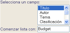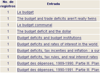 La siguiente imagen muestra una lista de 10 elementos que comienza con la palabra BUDGET. Observa que el sistema no toma en cuenta los artículos iniciales. Para desplazarte hacia delante y hacia atrás usa los botones