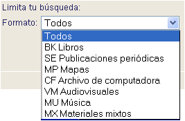 Elige el Formato en la sección Limita tu búsqueda en las opciones de la Búsqueda avanzada y Búsqueda simple-Por palabra clave para resultados más precisos. ![]() |